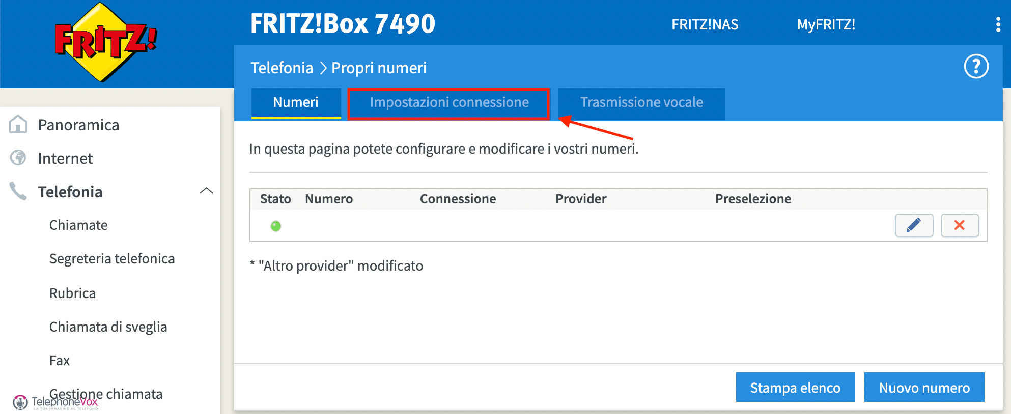 - Cliccare sulla voce “Telefonia” nel menù laterale sinistro. Quindi “Propri numeri”.